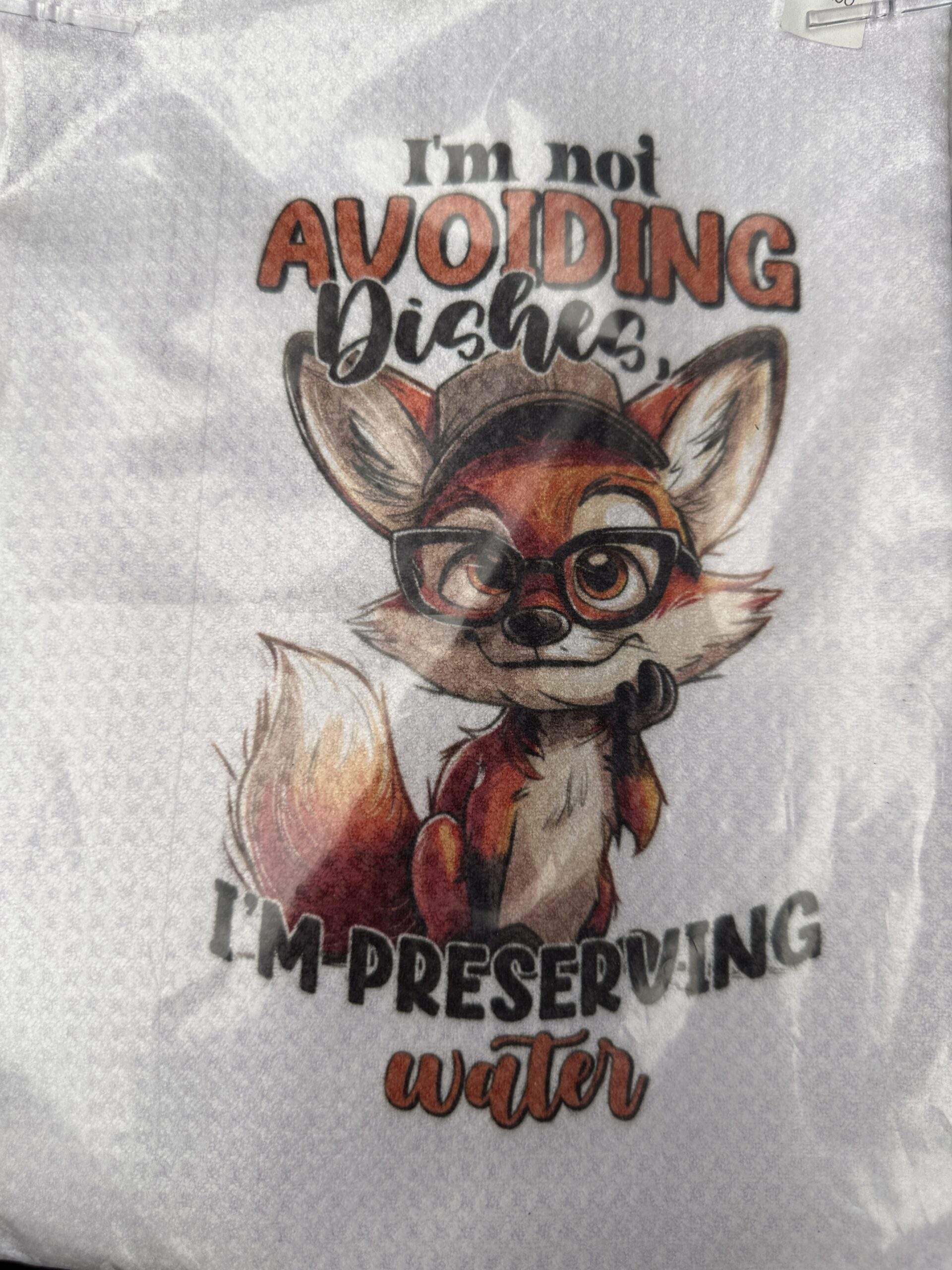 Text reads, “I’m not avoiding dishes, I’m preserving water!”
