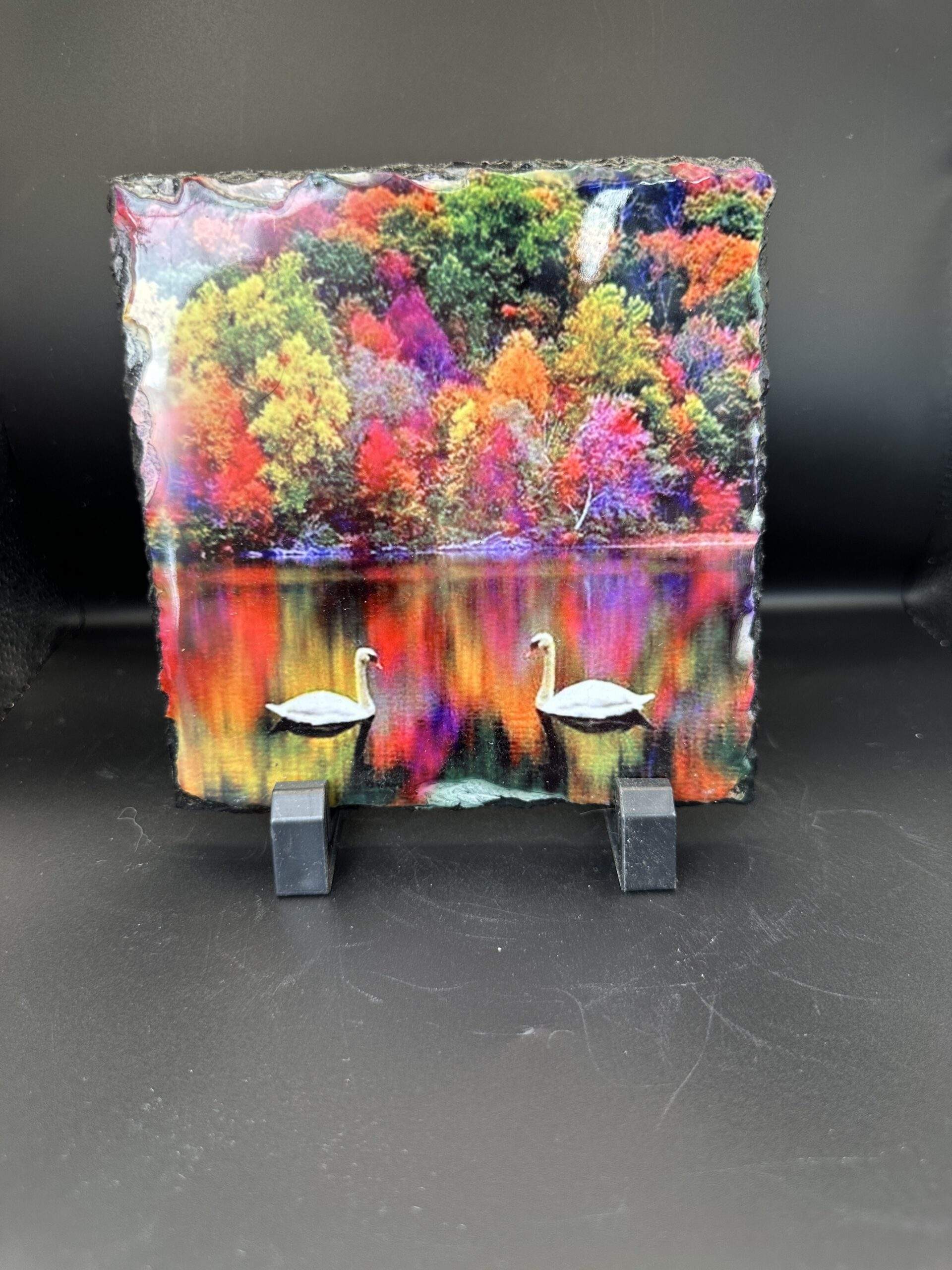 A stone slate with a glossy image of two white swans on a peaceful lake surrounded by trees in shades of reds, yellows, and pinks.